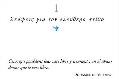 Υποτίθεται ότι υπάρχει ελεύθερος στίχος. Υποτίθεται ότι ο ελεύθερος στίχος είναι σχολή· ότι διαθέτει ορισμένες θεωρίες· ότι η ομάδα ή οι ομάδες των θεωρητικών του είτε θα κάνουν τη μεγάλη τομή στην ποίηση είτε θα την εξαχρειώσουν, εφόσον η επίθεσή τους στο ιαμβικό πεντάμετρο αποβεί επιτυχής. Δεν υπάρχει ελεύθερος στίχος και είναι καιρός αυτό το παράλογο μύθευμα να ακολουθήσει το elan vital και τους ογδόντα χιλιάδες Ρώσους στη λήθη.