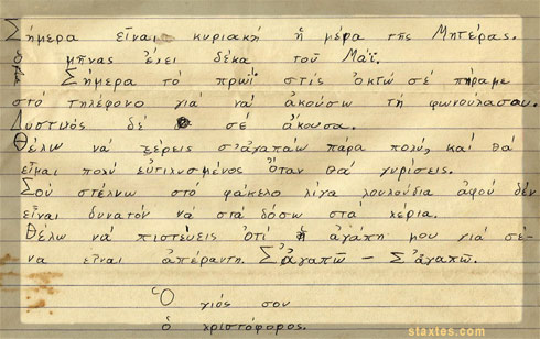 Το Καλοκαίρι θα έλθει σε λίγο και έτσι θα έχουμε τον ελεύθερο χρόνο για να μιλήσουμε. Αν έχεις προβλήματα, σε παρακαλώ να τα λες και να μην στεναχωριέσαι. Ελπίζω όλοι γύρω σου να είναι καλοί μαζί σου. Να διαβάζεις και να προσέχεις την υγεία σου. Μου λείπεις πάρα πολύ.