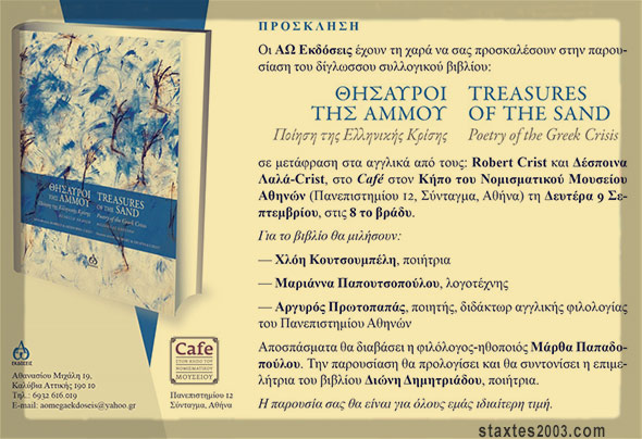 Η ποίηση (ίσως περισσότερο από κάθε άλλη μορφή έκφρασης) μπορεί με τη δύναμη του περιεκτικού της λόγου να αποτυπώσει την πολύμορφη τραυματική εμπειρία της ελληνικής κρίσης. Η δίγλωσση ανθολογία «Θησαυροί της Άμμου-ποίηση της ελληνικής κρίσης (Treasures of the sand-Poetry of the Greek Crisis), με τη συμμετοχή 38 ποιητών, σε αγγλική μετάφραση από τους: Robert Crist και Δέσποινα Λαλά-Crist, μετά την αμερικανική έκδοση από τις εκδόσεις Seaburn, κυκλοφορεί τώρα στην Ελλάδα από τις εκδόσεις ΑΩ.