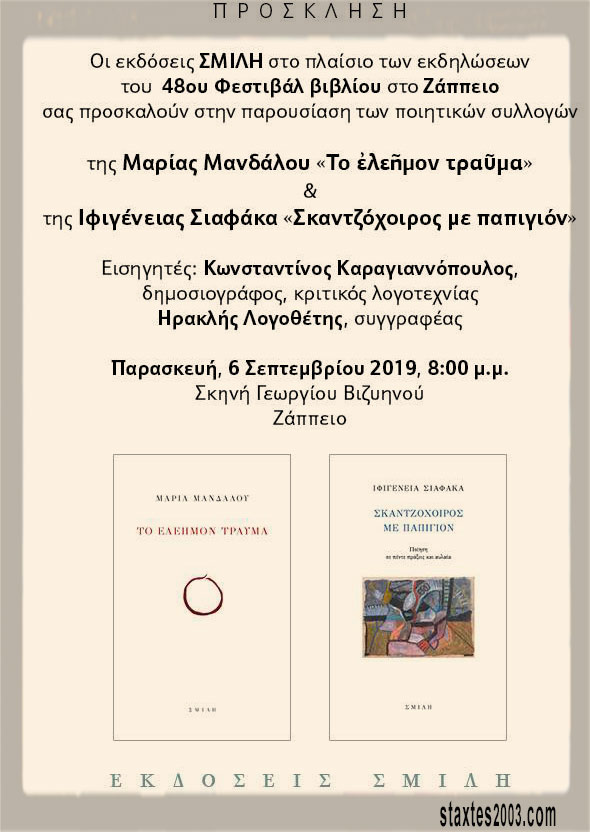 Πρόσκληση-Ζάππειο: Παρουσίαση ποιητικών συλλογών Μαρίας Μανδάλου και Ιφιγένειας Σιαφάκα Δημοσιεύθηκε την 02/09/2019 από SF Κοινοποιήστε: Πατήστε για κοινοποίηση στο Facebook(Ανοίγει σε νέο παράθυρο) Facebook Κλικ για κοινοποίηση στο LinkedIn(Ανοίγει σε νέο παράθυρο) LinkedIn Κάνε κλικ για να μοιραστείς στο X(Ανοίγει σε νέο παράθυρο) Χ Μου αρέσει! Φόρτωση... Σχετικά