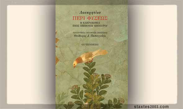 Η πρώτη, μετά από 107 χρόνια, έμμετρη μετάφραση του έργου της κλασικής γραμματείας (57 π.χ.) που επηρέασε τους μεγαλύτερους στοχαστές και επιστήμονες όλων των εποχών και τομείς όπως της θεολογίας, της βιολογίας, της σύγχρονης φυσικής, της υπαρξιακής και ηθικής φιλοσοφίας.