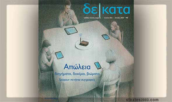 Κυκλοφορεί το ανοιξιάτικο τεύχος του περιοδικού (δε)κατα, #65, με θέμα την Απώλεια είναι στα βιβλιοπωλεία. Συνεργάζονται πενήντα τρεις συγγραφείς. Ιδού τα περιεχόμενα του τεύχους: Ι. Ν. Καζάζης, 1821-2021, Η πορεία συγκρότησης της γλώσσας του Νεοελληνικού Κράτους, Αγγελική Κορρέ, Nunc Dimittis, Μαρία Δαλαμήτρου, Μοντερνισμός και αναγκαιότητα της απώλειας, Νικήτας Σινιόσογλου, Για την έχθρα προς τον τόπο που αγάπησες, Λουκάς Γ. Κατσώνης, Η (δήθεν) απώλεια της εθνικής κυριαρχίας, Δέσποινα Παπαστάθη, Οι Ελεγείες της Κικής Δημουλά, Γεώργιος Δημόπουλος, Η Χώρας μας, ο χώρος μας, καημός ιστορικός, Ρίβα Λάββα, Απώλεια, Χ. Α. Χωμενίδης, Η κόμισσα, Φίλιππος Δρακονταειδής, Αναμνήσεις από το σπίτι του κρεμασμένου, Φίλιππος Φιλίππου, Απώλεια, τύχη, αγώνας, Διονύσης Μαρίνος, Γιατί δεν γελάτε; Ελίνα Τραϊφόρου, Τέσσερα κολάζ απώλειας, Νάντη Χατζηγεωργίου, Παυλίνα Μάρβιν, Σχέδια και στίχοι απώλειας, Κώστας Λάνταβος, Ο πατέρας, Πάνος Σταθόγιαννης, Απώλεια όρασης, Βικτώρια Μακρή, Το τελετουργικό της Φαϊζά, Μπέκη Μπλουμ, Βεραμάν, Χριστίνα Αργυροπούλου, Απώλειες, παραδόσεις, ήθη και έθιμα, Κατερίνα Ζαχαριάδου, Η απώλεια του Ηρακλή, Χρύσα Φάντη, Αυτός που δεν ήταν, Λίλυ Εξαρχοπούλου, Ζήνα, Πάνος Ι. Μαυρομμάτης, Κανένας Θεός, Τα δέκατα προτείνουν, Προτάσεις για βιβλία, Λίζα Καβάγιου, Το φράγμα του ήχου, Ευάγγελος Βαλσαμίδης, Το χέρι έδειχνε βόρεια, Κωνσταντίνος Μπούρας, Απώλεια, Μονό-πρακτο, Κλαίτη Σωτηριάδου, Το αγόρι που έφυγε, Λήδα Καζαντζάκη, Η σεναριογράφος, Πόπη Αρωνιάδα, Του σώματος το φέουδο, Αμαλία Μέλη, Η χήρα του Γενάρη, Αντώνης Μπαλασόπουλος, Η φωνή, Μαρία Δριμή, Πωλείται καρότσι μωρού, Χάρης Μεγαλυνός, Ζενέρικ, Λίνα Φυτιλή, Το πουλί Γαζία, Εύα Στάμου, Ανέπαφες συναλλαγές, Νίκος Οχάνες Μικιρδιτσιάν, Πού έχω παρκάρει; Φωτεινή Τσαλίκογλου, Απώλεια, η κρυφή ερωμένη της δημιουργίας, Ζέτα Κουντούρη, Η απώλεια της Κατερίνας Ζαρόκωστα, Βασίλης Μανουσάκης, Η απώλεια εξουθενώνει. Ο Κωνσταντίνος Μπούρας γράφει για την «Κόλαση της Τρεμπλίνκα» (μτφρ. Αλεξάνδρα Ιωαννίδου, Άγρα) και ο Ντίνος Σιώτης για τις «Πολιτικές μυθογένεσης» του Δημήτριου Γιατρομανωλάκη (Ίκαρος). Τέλος οι Παναγιώτης Βούζης, Θεόδωρος Γεωργίου, Γιώργος Σκαμπαρδώνης, Μαρία Λεβαντή, Κωνσταντίνος Ν. Ιωαννίδης, Ρίβα Λάββα, Λέλη Μπέη, Ηρώ Νικοπούλου, Θάνος Σταθόπουλος, Δημήτρης Μαγριπλής, Γιώργος Δ. Αναγνώστου, Σάρα Θηλυκού και Γιάννης Σιώτος, στις σελίδες «Μη μου πεις» γράφουν για τις πολλές όψεις και τα συμπτώματα της απώλειας.