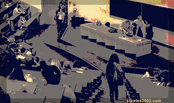 (Εσωτερικό μεγάρου. Τεράστια έδρανα, πελώριες πόρτες από χοντρό ξύλο. Ένα διαρκές μουρμουρητό πλανάται στον αέρα. Πανομοιότυπες φιγούρες, μαύρες μολυβιές στην απεραντοσύνη των αιθουσών. Ένας ψηφιακός πίνακας μετράει προοδευτικά, φθάνει ως το νούμερο ενενήντα εννέα, έπειτα ξαναρχίζει. Το φως πέφτει στο εσωτερικό από δυο μεγάλους γυάλινους φεγγίτες με εγκλωβισμένα πουλιά. Ο κύριος Χοπ τρέχει με τα σκαρπίνια του να χτυπούν στα μάρμαρα. Τακ τοκ, όλο και πιο γρήγορα. Έχει ραντεβού με τον κύριο Φίλιπ, νεαρό μα υποσχόμενο δικηγόρο, ο χρόνος θα δείξει πολλά ή λίγα. Ο κύριος Χοπ, σταματάει εμπρός στην αίθουσα. Συμβουλεύεται μια λίστα πάνω στο κλειστό φύλλο της ξύλινης θύρας.) Συνεχίστε την ανάγνωση του «Απόστολος Θηβαίος, Boutique Théâtre: Para la Salud»
